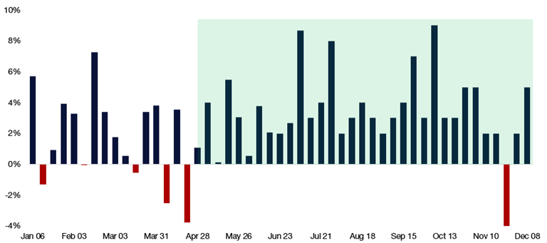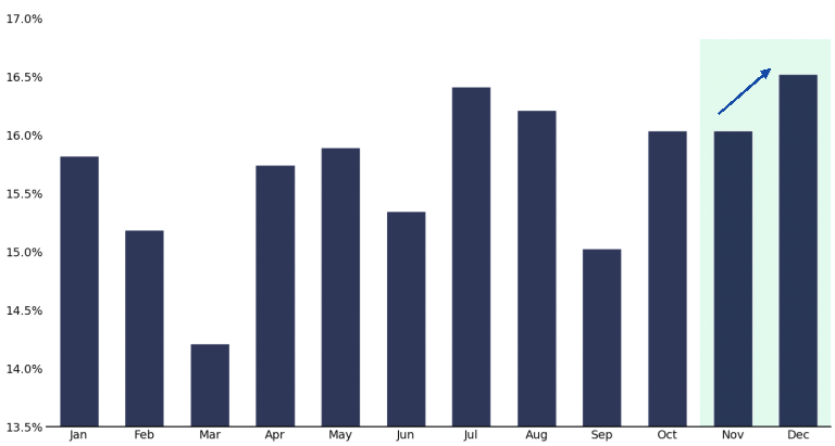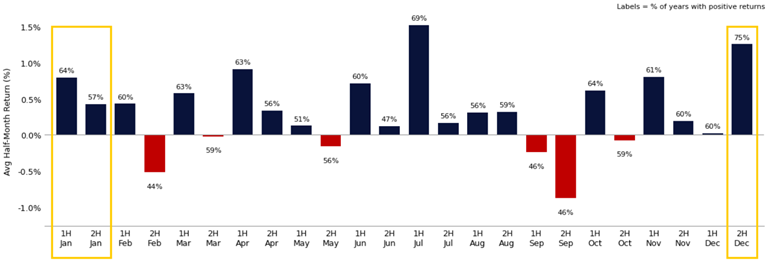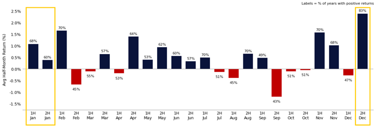 Seasonality remains supportive. The second half of December historically carries one of the highest hit rates of any two-week period, extending into January (i.e. The January Effect). Since 1928, the S&P 500 has risen 75% of the time during the latter half of December, with an average return of +1.3%, while trading volumes typically decline, amplifying price impact.