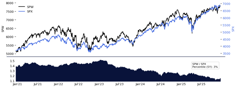 Despite this progress, dispersion remains elevated. The performance ratio of SPW versus SPX sits in the 15th percentile over the past yer and the 3rd percentile on a five-year basis, suggesting ample runway for continued rotation.