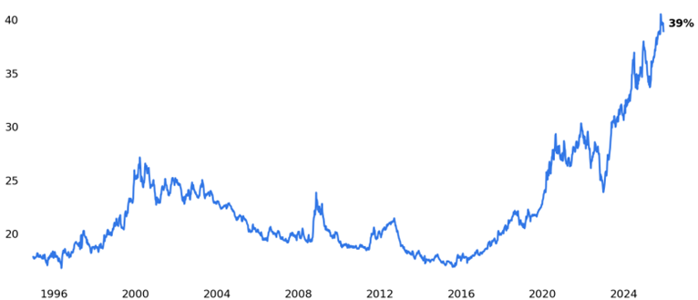 Retail participation is structurally higher and poised to remain so into 2026. Elevated engagement, rising household wealth, broader equity adoption, and historically high cash balances together create one of the strongest retail backdrops of the past decade. Seasonally, retail participation tends to rise into year-end as liquidity thins – amplifying its market impact.