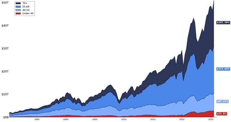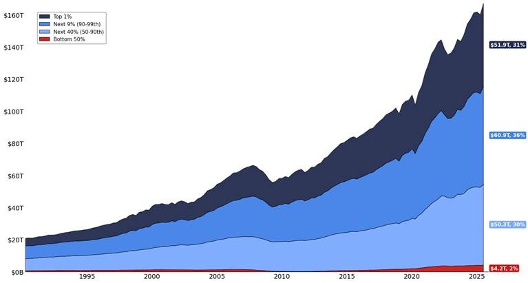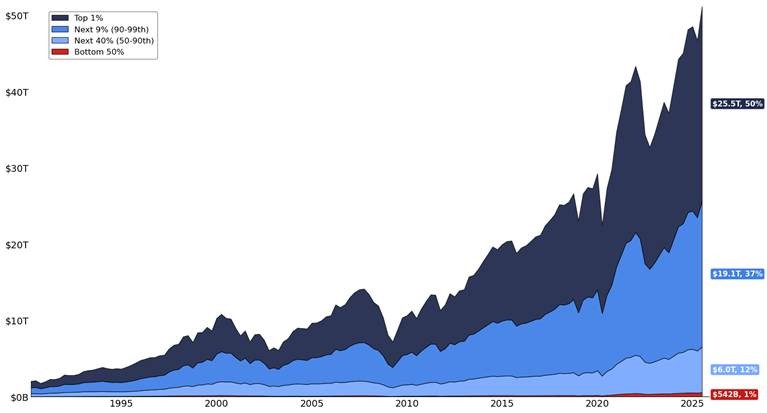 The balance-sheet backdrop is compelling. Total household wealth stands at record highs across all percentile groups. Notably, the bottom 50% – historically the least engaged in equities – has experienced the fastest rate of wealth accumulation and now holds more than $4 trillion in net worth. Indexed wealth data highlights a decade-long expansion of the retail wallet: since 2010, percentage wealth growth for the bottom half has far outpaced higher-wealth cohorts.