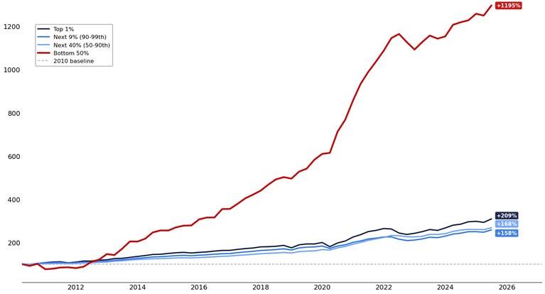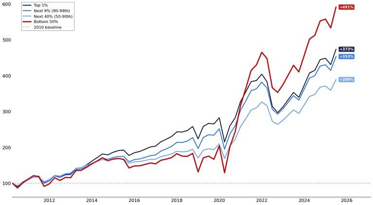 This wealth accumulation has translated directly into equity ownership. All percentile groups now hold more equities, with the steepest gains again coming from the bottom 50.
