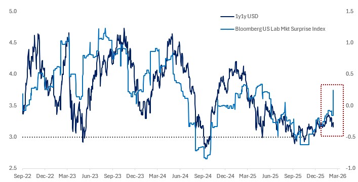1y1y USD Swaps; Bloomberg US Labour Markets Surprise Index
