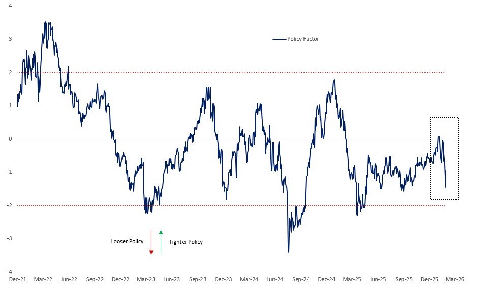 THE CURRENT POLICY MIX IS HISTORICALLY LOOSE. Fiscal policy remains highly stimulative: CBO data show the deficit as a share of GDP sits in the 16th percentile of its 64-year history and the 35th percentile of its 20-year history (where a lower percentile implies a larger deficit and therefore greater stimulus). Monetary conditions are similarly accommodative. The Fed has delivered 175bp of rate cuts, and financial conditions now sit at their easiest level since April 2022. The 12-month impulse in the Fed’s FCI-G (rolling 12m change) is in the 12th percentile of its 25-year history, underscoring how significant the easing shift has been. This combination of very loose fiscal and very loose monetary policy is unusual outside of crisis periods. The Fed began cutting in September 2024 to safeguard the labour market…since then, the unemployment rate has risen just 0.2% from the start of the easing cycle and remains only 0.9% above the 3.4% cycle low reached in April 2023. Labour market concerns are fading fast, consensus growth expectations have been revised higher (from 1.8% for end-2025 to ~2.3% today), and AI-related capex continues to exceed expectations. Despite this improving macro backdrop, markets still price a terminal Fed rate just above 3%…essentially the same endpoint priced during peak labour market concerns in September 2025. The result is financial conditions that are easier relative to the growth trajectory than would typically be expected. Ordinarily, improving growth would prompt markets to price a more hawkish policy path, tightening conditions in a countercyclical fashion. That offset has so far been absent – likely reflecting some combination of a “Fed chair premium” and expectations of a powerful AI-driven productivity boom. We can see this empirically by decomposing the move in financial conditions using my colleague Frank Flight’s cross-asset framework, which isolates the drivers in stocks, yields, credit and FX into growth and policy vectors using principal components analysis. The decomposition shows a significant decline in the policy factor (PC2, chart below) – effectively a sharp repricing toward easier conditions. That move appears inconsistent with the policy-relevant data over the past week, which has included stronger jobs data and firmer PCE expectations. In other words, markets have pushed yields lower and eased financial conditions further even as the growth backdrop has strengthened and the case for additional policy easing has diminished.