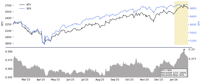 That shift is evident in small-cap relative performance. The RTY/SPX ratio reached a one-year high on January 22nd, reflecting strong early-year leadership from smaller-cap, higher-beta exposure.