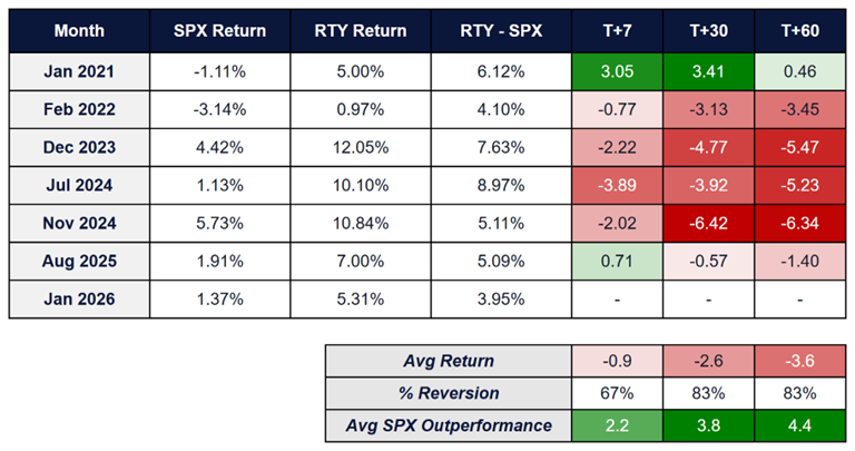 RTY outperformed SPX by 3.9% in January, which has only happened 6 other months in the last five years. Looking back at subsequent performance during those periods, it is possible we see further consolidation in the RTY vs. SPX spread over the next 60 days.