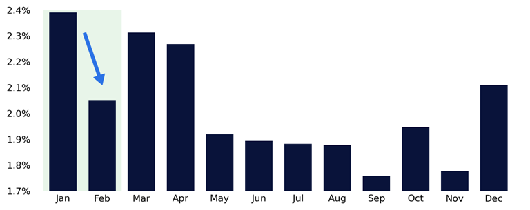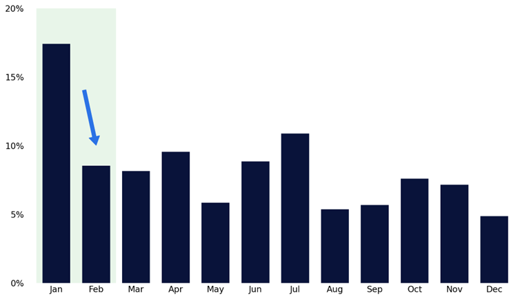 February seasonality is best viewed as a reflection of this mechanical shift in demand. Historically, February has been the second weakest month of the year, with the S&P 500 averaging -9bps since 1928 and posting the second-lowest hit rate of any calendar month.