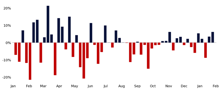 Intramonth dynamics reinforce this pattern. 2H February has historically seen more uneven price action, with early gains often giving way to consolidation or pullbacks as early-year positioning settles.