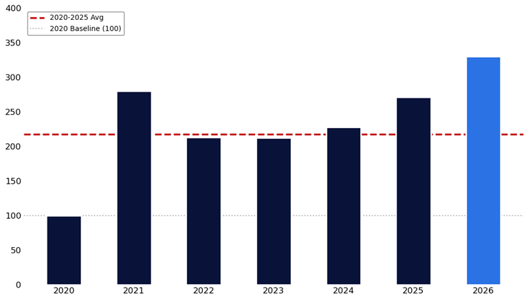 January Average Daily Contracts, Indexed to 2020