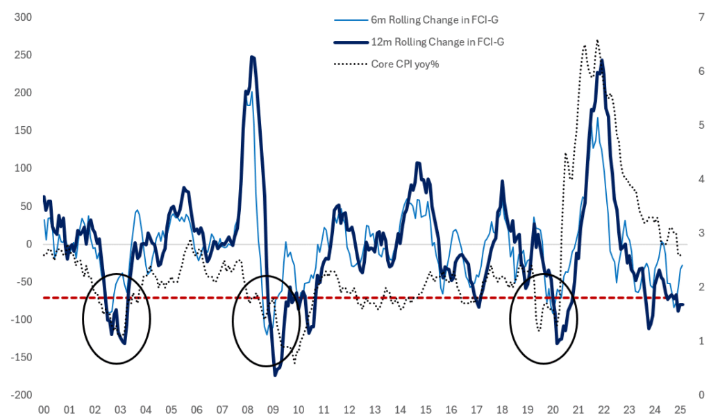 I asked macro strategist, Frank Flight for his updated views on policy. US Financial Conditions are at the lowest level since March 2022 and remain accommodative. The change in FCI matters the most, that means you capture the easing impulse. The 12-month rolling change in FCI is also historically large.