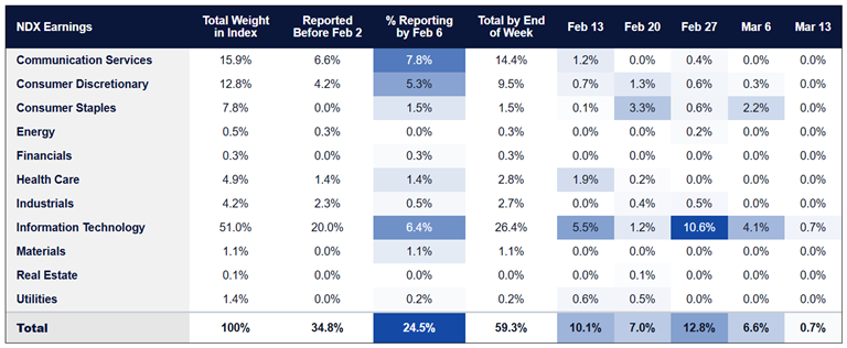Earnings by Sector – NDX Weight Reporting per Week (%)