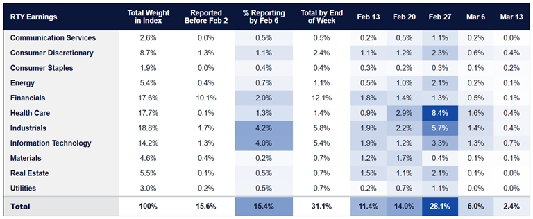 Earnings by Sector – RTY Weight Reporting per Week (%)