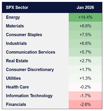 Energy, Materials, Consumer Staples, and Industrials led performance to start the year, while Technology and Financials lagged. This reflected improving breadth beneath the surface and a broader participation profile to start the year.