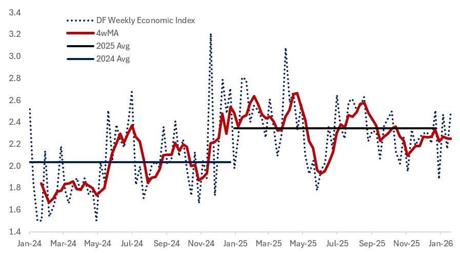 THE FED IS LIKELY NOW ON HOLD FOR THE FORESEEABLE FUTURE…after acknowledging the reality of stronger economic growth and a shift in the balance of risks away from its employment mandate at this week’s meeting. The FOMC statement highlighted what regular readers of this note have known for some time…“economic activity has been expanding at a solid pace” (upgraded from “moderate” in December), and “the unemployment rate has shown some signs of stabilization” having “edged up” last month. Chair Powell’s press conference reflected the tone of a committee that broadly feels the policy rate is no longer in restrictive territory, having moved much closer to most estimates of neutral (~3.25%) following 75bps of insurance cuts last year. Downside risks to employment have improved more than upside risks to inflation. This makes sense…while there remain some concerns around the labour market, consumption and business investment are strong and corporate earnings robust. The Dallas Fed has Q4 GDP tracking at 2.49%, whilst The NY Fed’s Nowcast is at 2.74% despite the prolonged government shutdown, from which we can expect a bounce this quarter. The US economy has once again shown its resilience, rebounding strongly from last year’s tariff tantrum. With an almost unprecedented policy mix of easy financial conditions, loosening monetary policy, and incoming large fiscal stimulus from OBBA (with perhaps more to come in an election year), nominal GDP is likely to be in the 5–6% range this year. With this backdrop, inflation risks may well move into the foreground in coming months…so I do not expect further rate cuts – certainly, from the Powell Fed – and perhaps for the entire year.