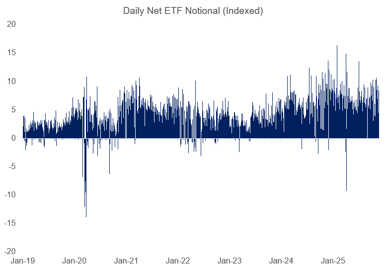 Retail investors have remained steadfast net buyers for 22 consecutive months, continuing to add risk even amid recent market volatility and factor unwinds. 158 straight days of net ETF buying underscores the resilience of retail conviction and a disciplined approach to dip-buying. However, our observational analysis suggests that once volatility surpasses a VIX level of 35, retail behavior shifts meaningfully, with extreme selling activity accelerating – marking this as a potential threshold where retail begins to de-gross. Limited observations in extreme scenarios means results at those levels should be interpreted with caution.