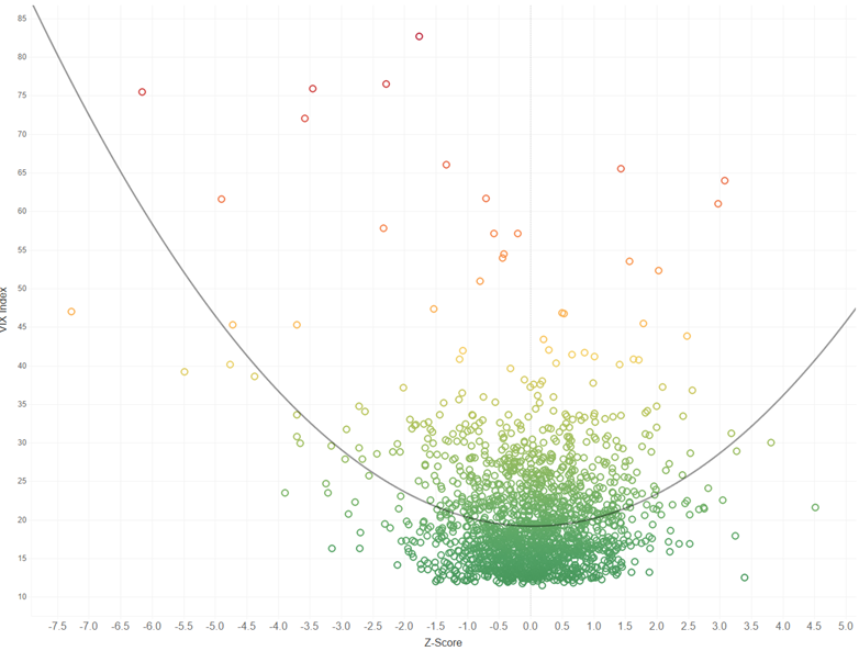 To further contextualize retail investor behavior, we analyzed daily net retail activity (expressed as z-score) versus the closing level of the VIX Index. This framework allows us to assess how retail investors respond across different volatility regimes.