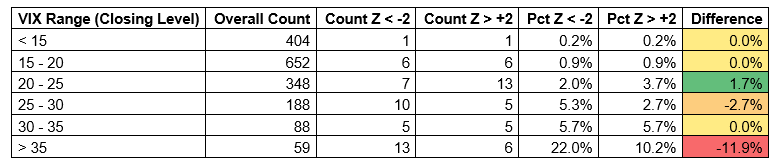 Taking this one step further, we cluster different VIX regimes into buckets and count the number of extreme events (which we define as net activity either below -2.0z or greater than +2.0z). Retail investors tend to be fairly balanced in their response as the average level of VIX increases, up until a VIX level of 35. At this point, we observe twice as many extreme net sell days than net buy days, which may imply that a closing level of 35 in VIX is the inflection point where retail may start to de-gross (and possibly capitulate). Keep in mind that there isn’t much data for the extreme cases, so results in those areas should be tested with appropriate caution. In addition, the data appears to exhibit heteroskedasticity, meaning that variability increases in the more extreme cases – so relationships at elevated VIX levels may be less stable.