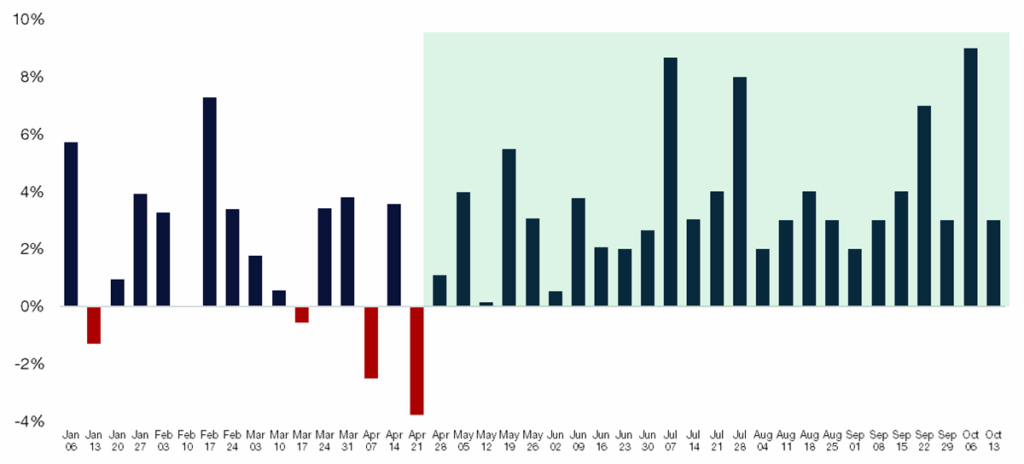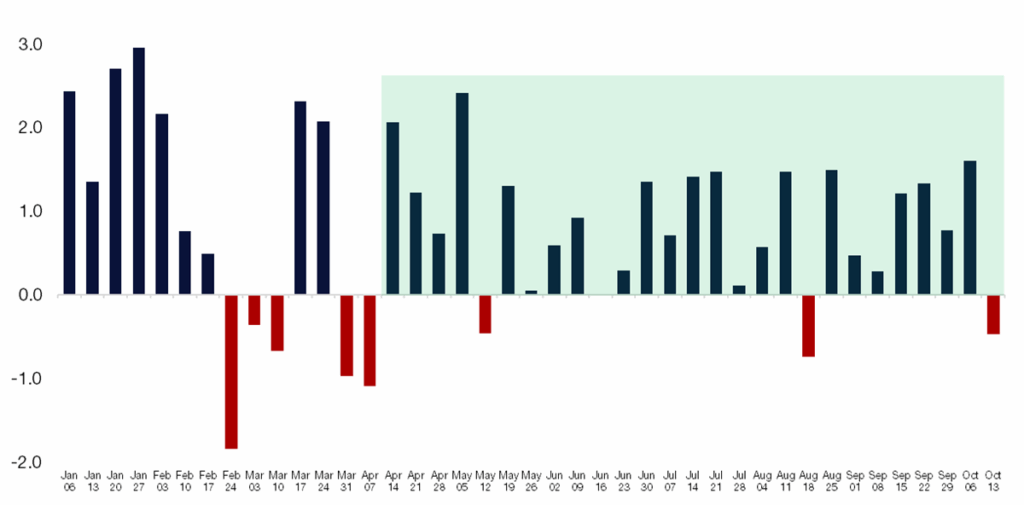 Source: Bloomberg as compiled by Citadel Securities, as of October 24th, 2025. Figures are for illustrative purposes only. Past performance figures do not guarantee future results.NDX Monthly Performance