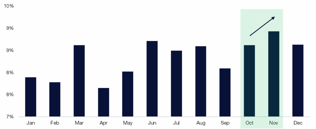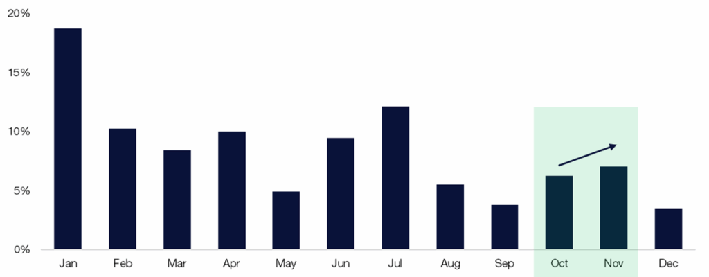 Source: Citadel Securities, as of October 24th, 2025. Figures are for illustrative purposes only. Past performance figures do not guarantee future results.2. Citadel Securities’ Retail Equity client seasonal demand trends from the last 8 years: Sep weakest → Oct builds → Nov strongest