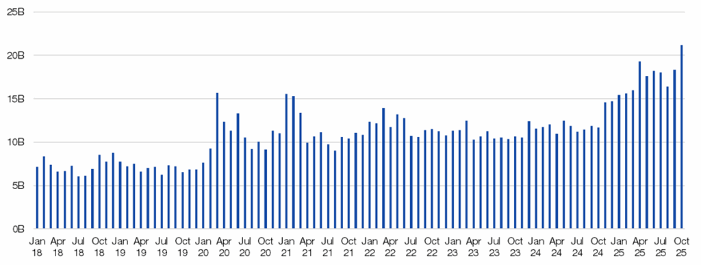 Source: Citadel Securities, as of October 24th, 2025. Figures are for illustrative purposes only. Past performance figures do not guarantee future results.US Daily Market Equity Volume (Shares)