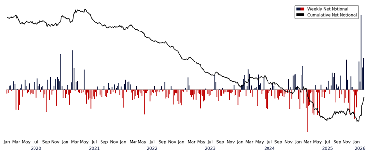 Scott Rubner, Head of Equity and Equity Derivative StrategyThe January Effect saw robust demand across both retail and institutional channels at Citadel Securities. Heavy capital deployment, active rotation, and elevated participation provided strong early-year support for risk assets, allowing markets to absorb headline volatility without meaningful drawdowns. US equities are at an all-time high today and Citadel securities client flows are hitting records. Citadel Securities retail net cash flows to start the year are off to a record start, running just about 50% higher YTD than the next highest year (2021).