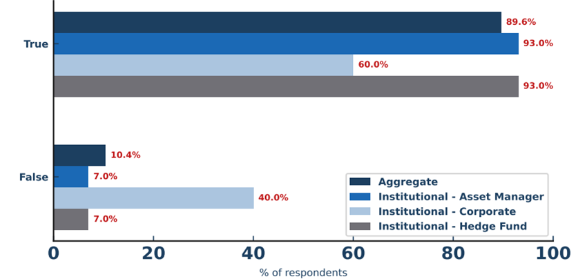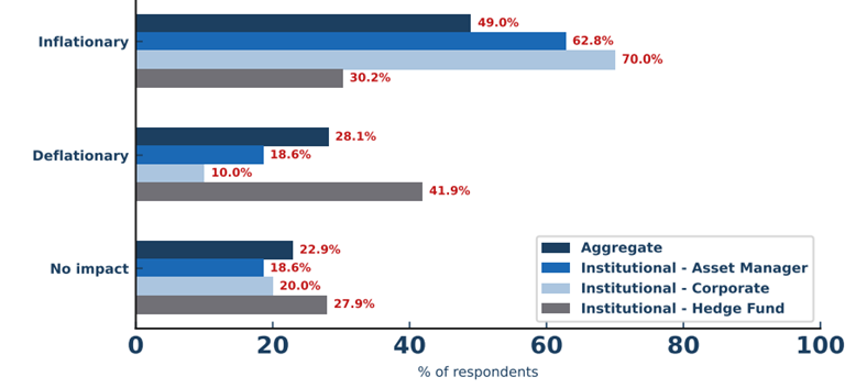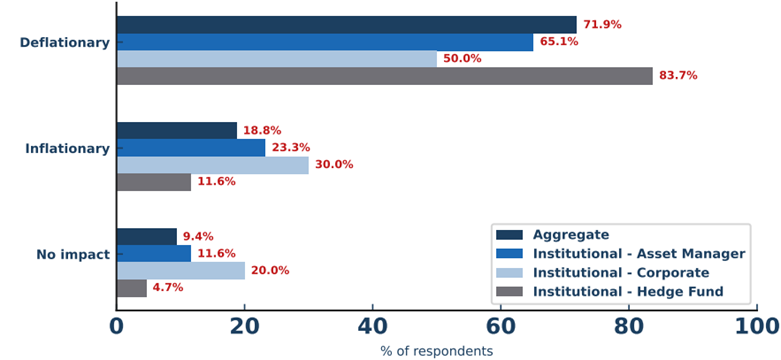 The primary channel via which AI should impact macroeconomic variables is of course productivity. Generally speaking our survey results suggest that institutional respondents expect AI to deliver a meaningful increase in productivity, but the composition of respondents is interesting. 89.6% of respondents expect AI to deliver a positive productivity shock however among corporate respondents the expectation of a positive productivity shock was meaningfully lower at just 60%. We would note that corporate client responses represented only around 10% of total respondents, so we would not over index to these results due to small sample size, but the contrast vs hedge fund and asset manager respondents is interesting.