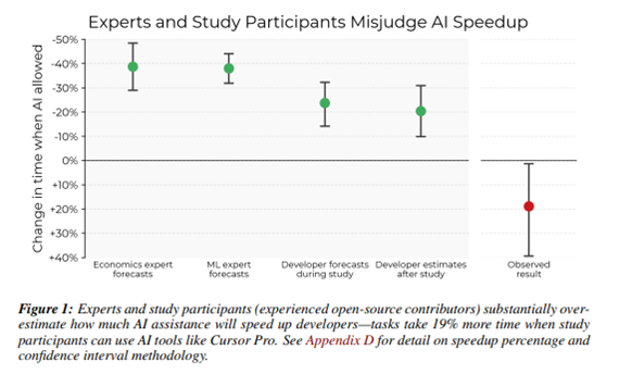 Source: Joel Becker, Nate Rush, Beth Barnes, David Rein, “Measuring the Impact of Early-2025 AI on Experienced Open-Source Developer Productivity”, METR, 2025