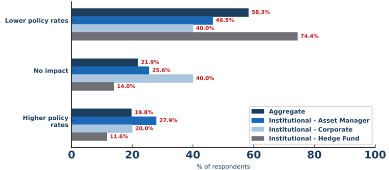 The implications of AI for monetary policy are interesting in that a positive productivity shock would tend to have dovish implications for monetary policy, as it would generally be associated with lower inflation and higher unemployment. However a positive productivity shock generally causes neutral rates to rise and drives risk appetite expansion, which tends to ease financial conditions via risky asset performance, making the implications for monetary policy less clear. One can think of AI as raising the speed limit for the economy, in terms of the growth achievable without creating inflation, however its difficult to assess the neutral rate and interaction with prevailing economic impulses and hence the risks of miscalibrating policy are high in the context of the AI boom, especially given the countervailing forces of tariff policy, immigration restrictions and the debasement theme. Furthermore the impact of AI on productivity needs to realise very quickly relative to history in order to offset some of the clearly inflationary forces associated with data centre build out, energy intensity of compute and potential commodity price appreciation in order to neutralize monetary policy implications which skew more hawkish in the short term. Regarding the medium term implications for monetary policy – the Greenspan Fed during the 90s is a relevant analog here as the Maestro responded to the technological productivity gains of the 90s by allowing the economy to run hot via easier policy/lower policy rates than would have been implied by policy rule models, as growth averaged 3.5-4% in the second half of the decade and unemployment fell below 5% (and estimates of NAIRU) without eliciting pre-emptive rate hikes. Despite his caution against “irrational exuberance” Greenspan de-emphasized the policy relevance of significant asset price inflation until it showed up in measured consumer price inflation which, subsequently resulted in sharp policy tightening and the end of the dot-com bubble. Interestingly hedge fund respondents to our survey see the impact of AI on monetary policy as clearly skewed dovish as 74.4% expect lower policy rates relative to just 58.3% of aggregate respondents, potentially reflecting an expectation of a productivity driven easing of the monetary stance similar to the 90s.