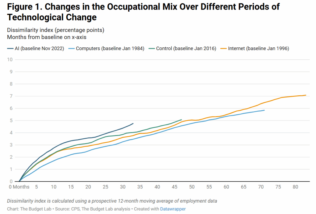 These results go some way to explain the puzzle of the low hire, low fire dynamics in the US labor market. It also helps explain the gap between the seemingly weak spot of labor market data vs other US macro data, and is consistent with the official data which shows the U-rate has risen disproportionately for young workers vs the general workforce. However – recent work from the Yale budget lab (Gimbel et al. 2025) pushback on this idea too, by creating dissimilarity indexes (that measure how the occupational mix of the labor force is changing month to month to get a sense of if AI (or anything else) is disrupting existing labor market patterns), in order to assess if there are obvious changes relative to pre-pandemic baselines since the advent of Chat-GPT. The changes in occupational mix appear to be only ever-so-slightly quicker than in previous periods of technological change (internet and computers) – which notably did not result in labor market disruptions. Furthermore the authors note that “taking a closer look at recent years, the data suggests that this recent trend is not necessarily attributable to AI (Figure 2). Shifts in the occupational mix were well on their way during 2021, before the release of generative AI, and more recent changes do not seem any more pronounced, even as the use of AI continues to grow in popularity” (Gimbel et al. 2025).