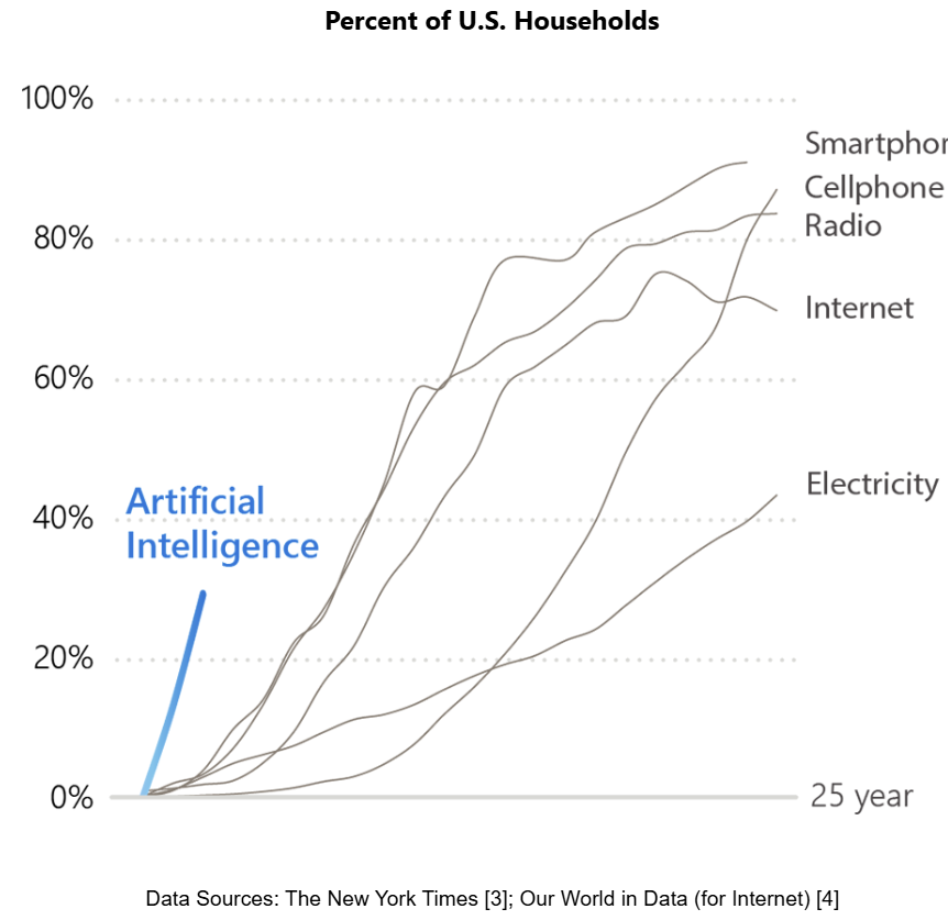 The extent to which AI will have a disruptive impact on the labor market is likely to be somewhat determined by the speed of adoption, given the historical precedent of labor markets adapting to technological change through time. The evidence thus far on AI adoption is that it is running ahead of recent modern technological innovations. A Microsoft report on AI adoption implies AI is “the fastest-spreading technology in human history. In less than three years, more than 1.2 billion people have used AI tools, a rate of adoption faster than the internet, the personal computer, or even the smartphone.” Furthermore Bick et al (2024) “report the combined results of two surveys fielded in August and November 2024, which collectively included more than 10,000 respondents” and demonstrate that 39 percent of respondents report using genAI either for work or outside of work. However the novel contribution of this study is to differentiate between professional and personal use. The study implies “the adoption of genAI has so far been at least as fast as adoption of computers and the internet. In 1984, 25 percent of workers reported using computers for their job, compared with 27 percent of workers who report using genAI for their job in 2024…In contrast, genAI has been adopted at a faster rate than computers outside of work.” These comparisons index to similar t=0 points and so provide a somewhat more balanced perspective on AI adoption in a professional capacity seeing something more similar to the adoption of computers, which is important when considering the macroeconomic impact of AI on labor markets in particular.